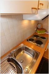 Küchenzeile mit E-Herd, Backofen, Mikrowelle, Kühlschrank, Geschirrsüler, Kaffeemaschine, Wasserkocher, Handtücher